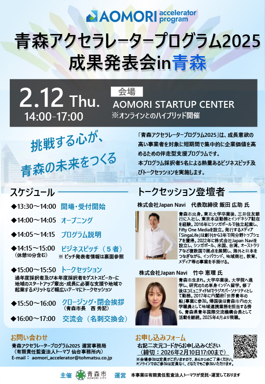 青森アクセラレータープログラム2025の成果発表会を開催します!本成果発表会では、伴走支援を受けた本年度プログラム採択者5名によるビジネスピッチに加え、